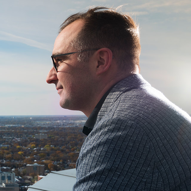 Large open, carpeted space with bow windows facing East. Great view overlooking the famous Portage & Main intersection.